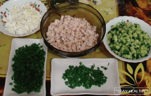 Vařte prsa a vejce, nakrájejte všechny komponenty okroshka